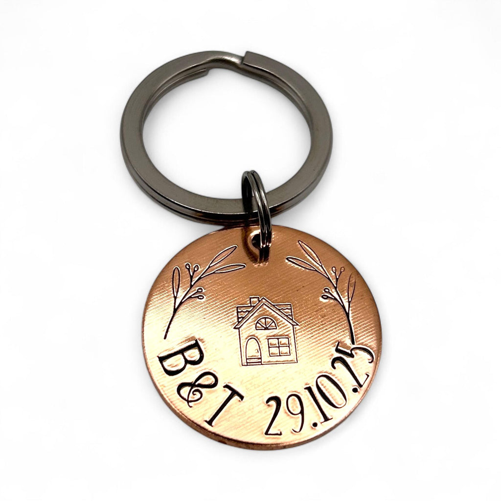 Emportez un petit bout de votre maison partout avec vous grâce à ce porte-clés personnalisé gravé à la main. Chaque disque est gravé à la main avec deux initiales et d’un petit motif de maison, pour un souvenir plein de sens — parfait pour un nouveau propriétaire, un couple, ou toute personne attachée à son foyer.