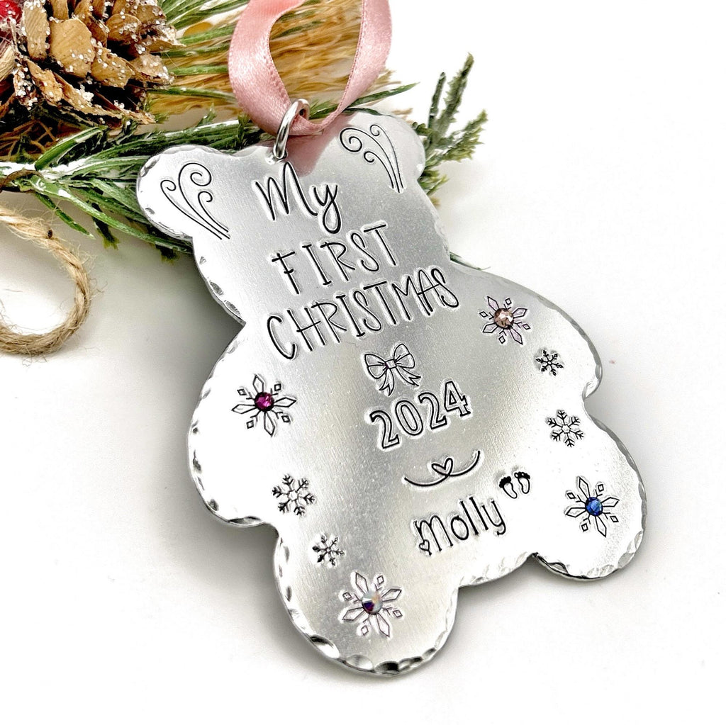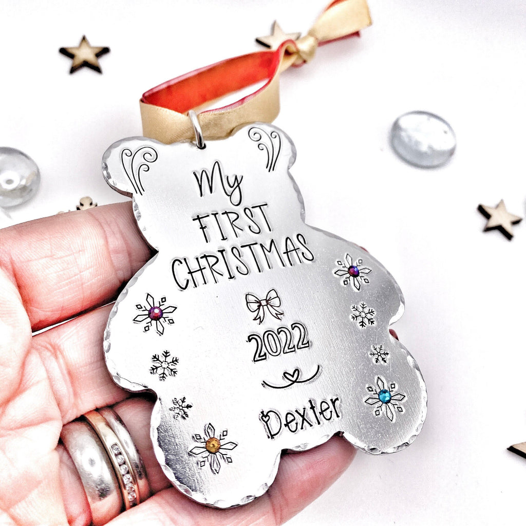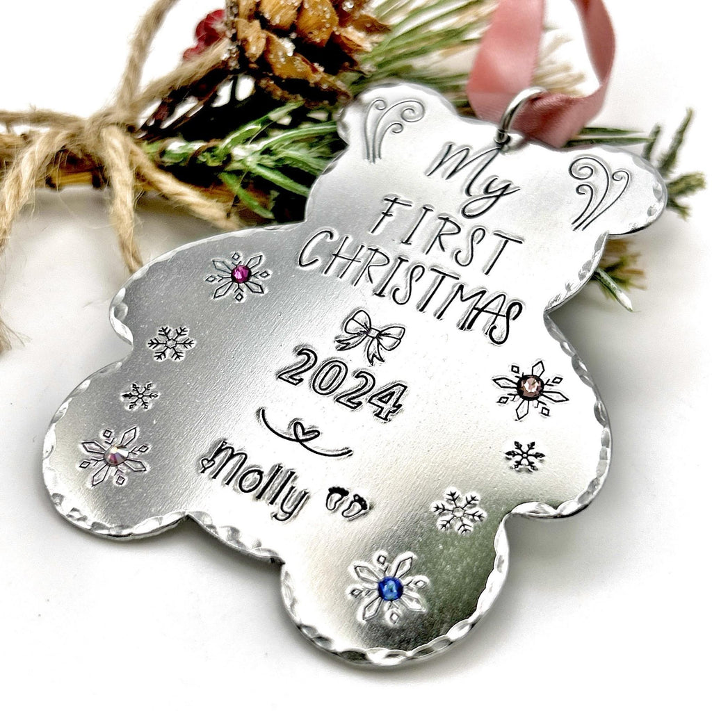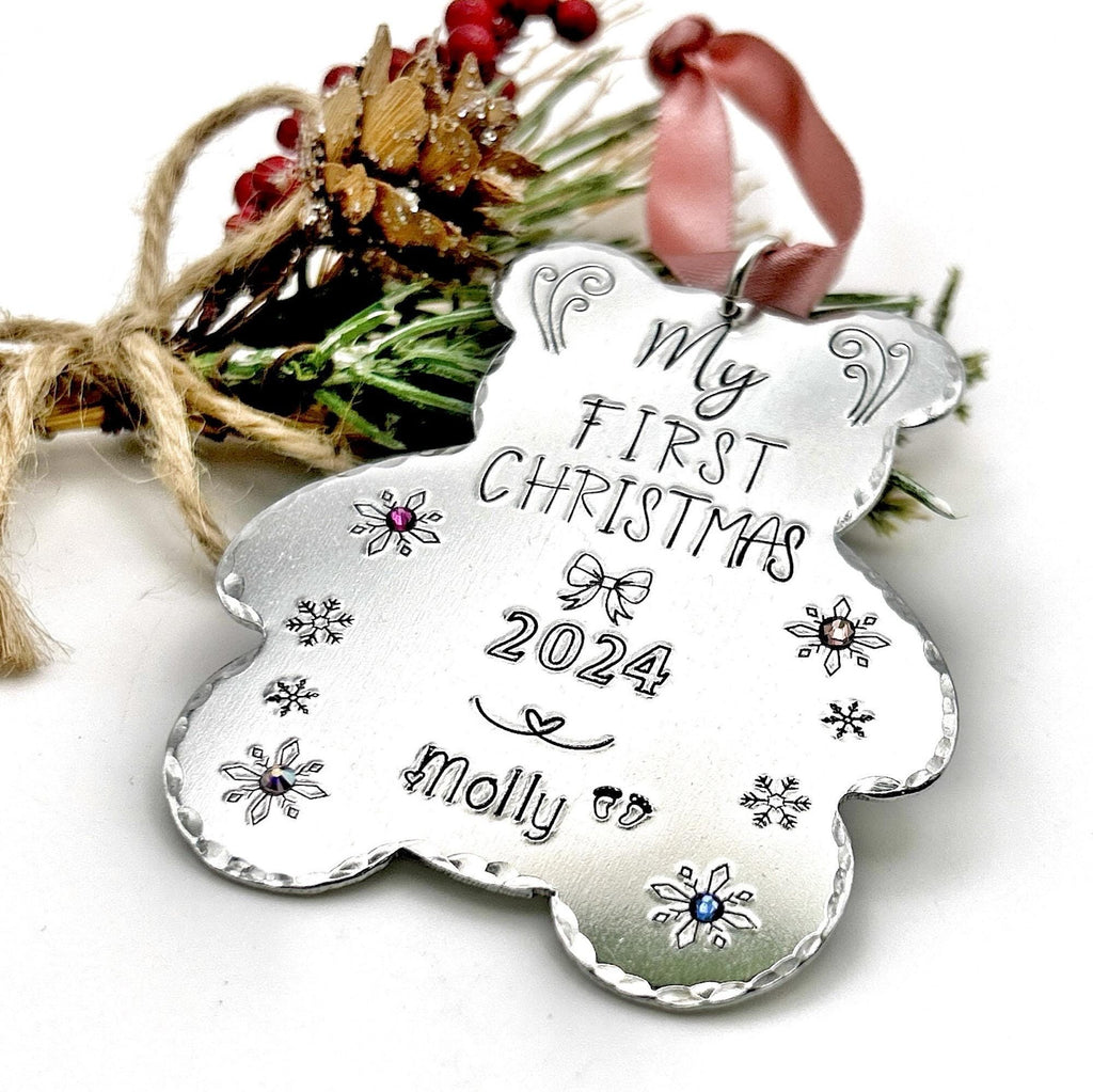 Cette décoration de Noël en aluminium a été gravée à la main. Un cadeau personnalisé et unique pour un bébé de 2024.