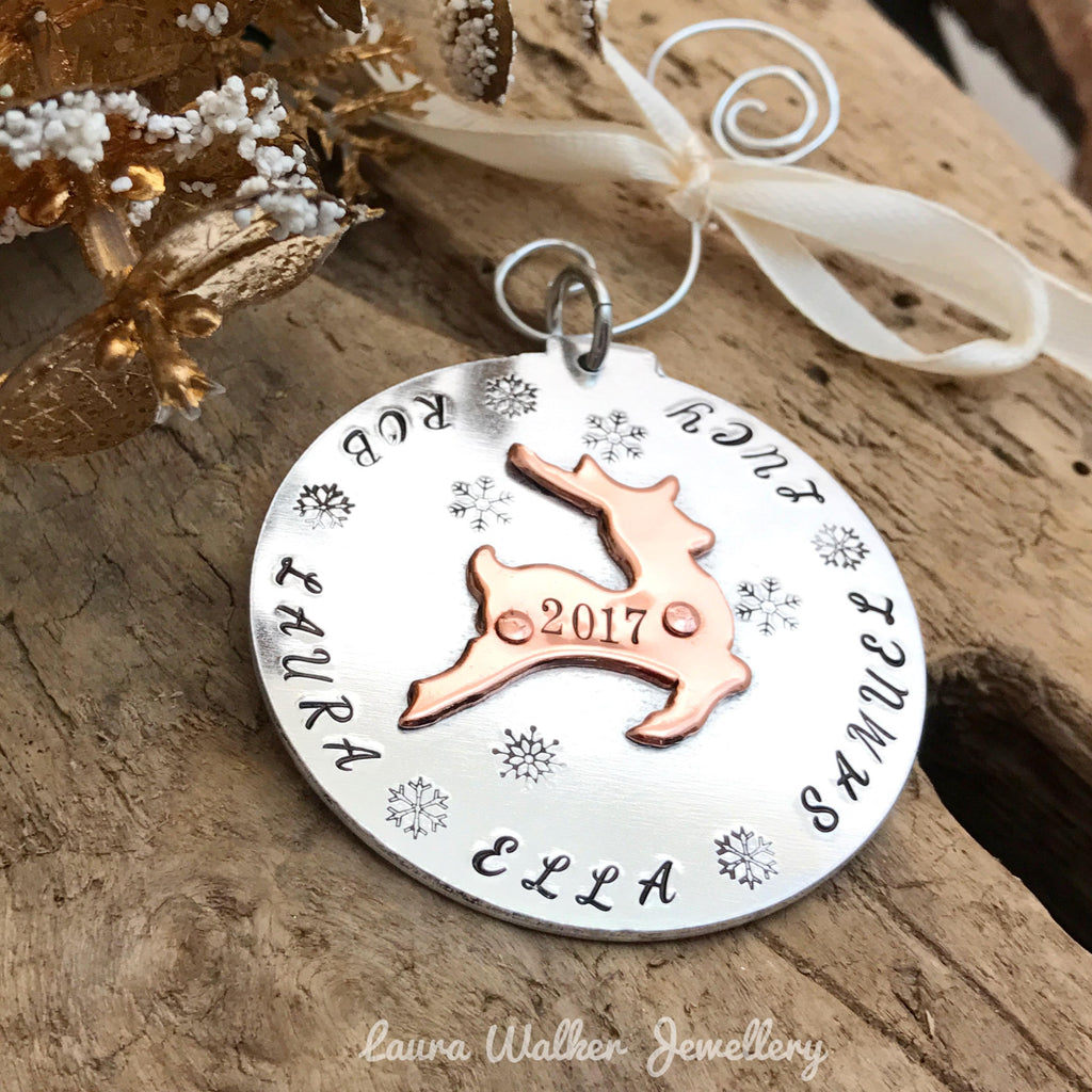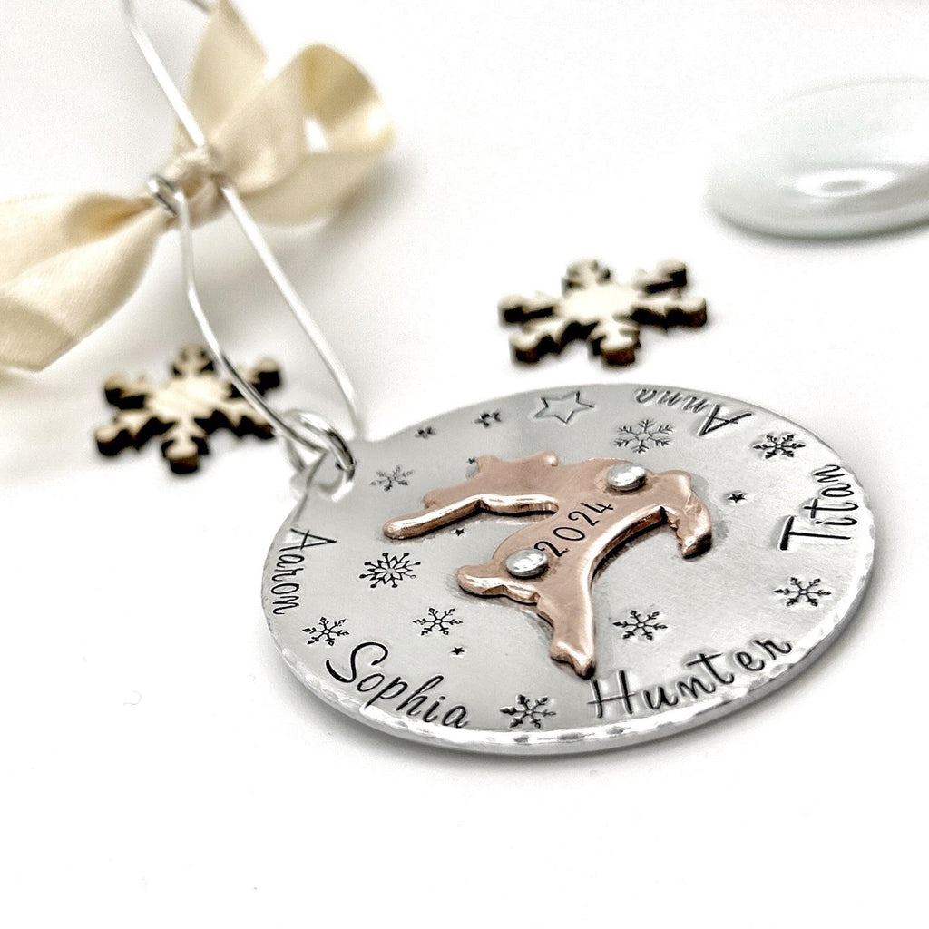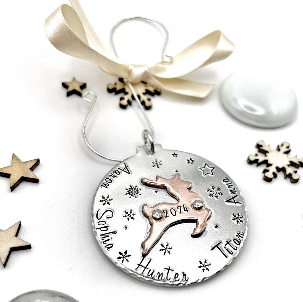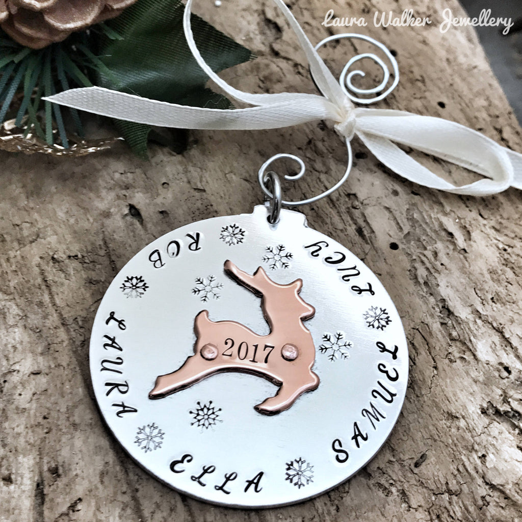 Cette jolie boule de noël a été gravée à la main. Je peux personnaliser avec les noms de la famille.