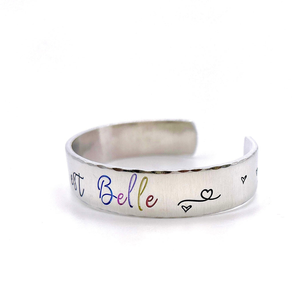 La gravure à la main implique des lettres individuelles martelées sur une pièce de métal vierge. Mes articles ne sont pas gravés à la machine. Tous les caractères seront estampillés à la même profondeur mais peuvent ne pas être parfaitement droits. Ce n'est pas un défaut et ça ajoute au caractère unique de mes bijoux. Les caractères estampillés peuvent parfois apparaître sur le dos du métal, c'est tout simplement dû à la technique de marquage de bijoux, c'est pourquoi les éléments ne peuvent être gravés que sur un côté.