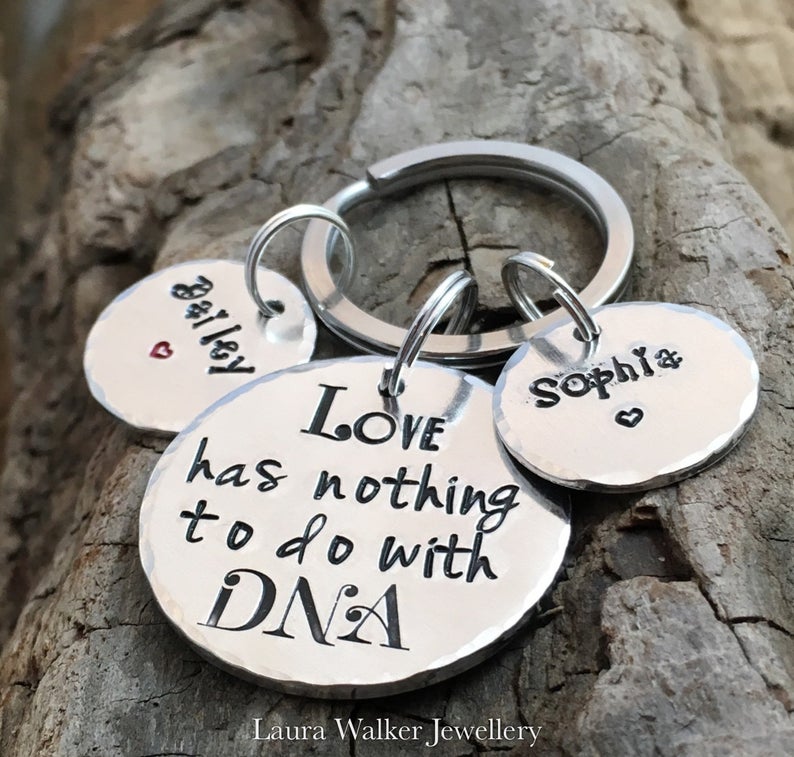 Hand Stamped Step-Dad Keychain, 'Love has nothing to do with DNA'