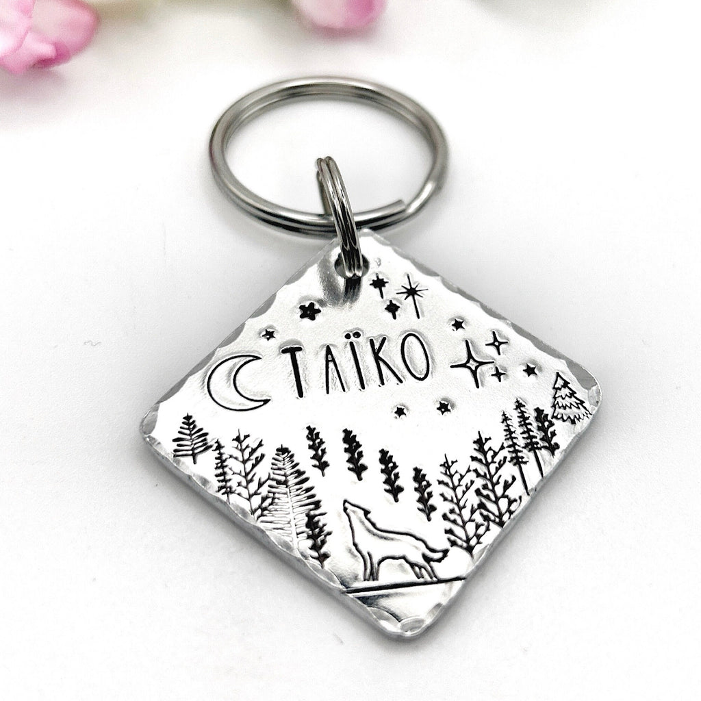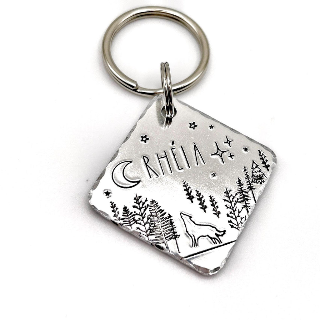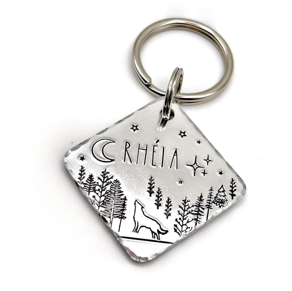 Médaillon d'identification, Médaille avec Loup, Lune et Arbres, Personnalisée