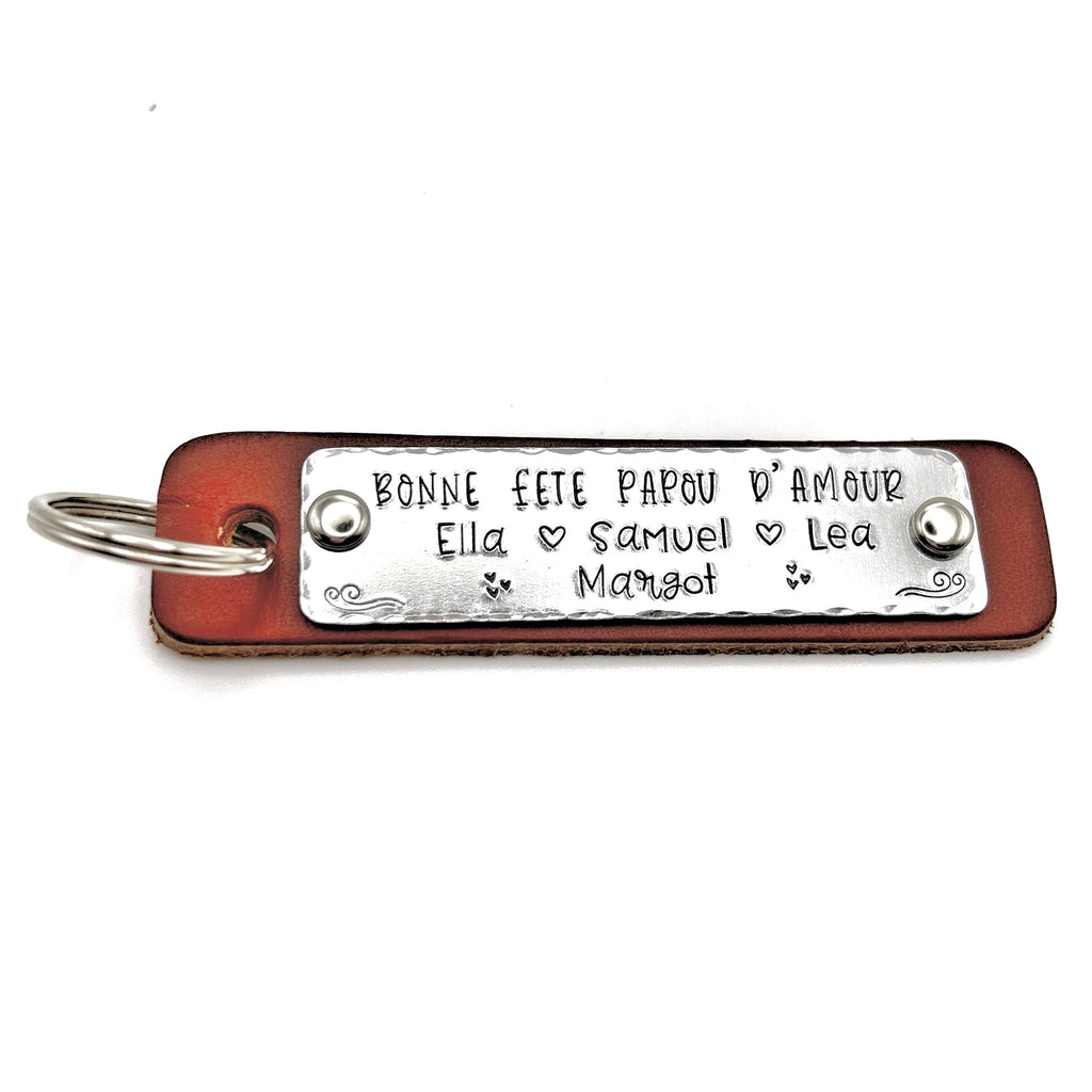Offrez à votre Papy un cadeau fait avec amour ! Ce porte-clés personnalisé gravé à la main en cuir et aluminium est parfait pour lui rappeler ses petits-enfants ou un moment spécial.