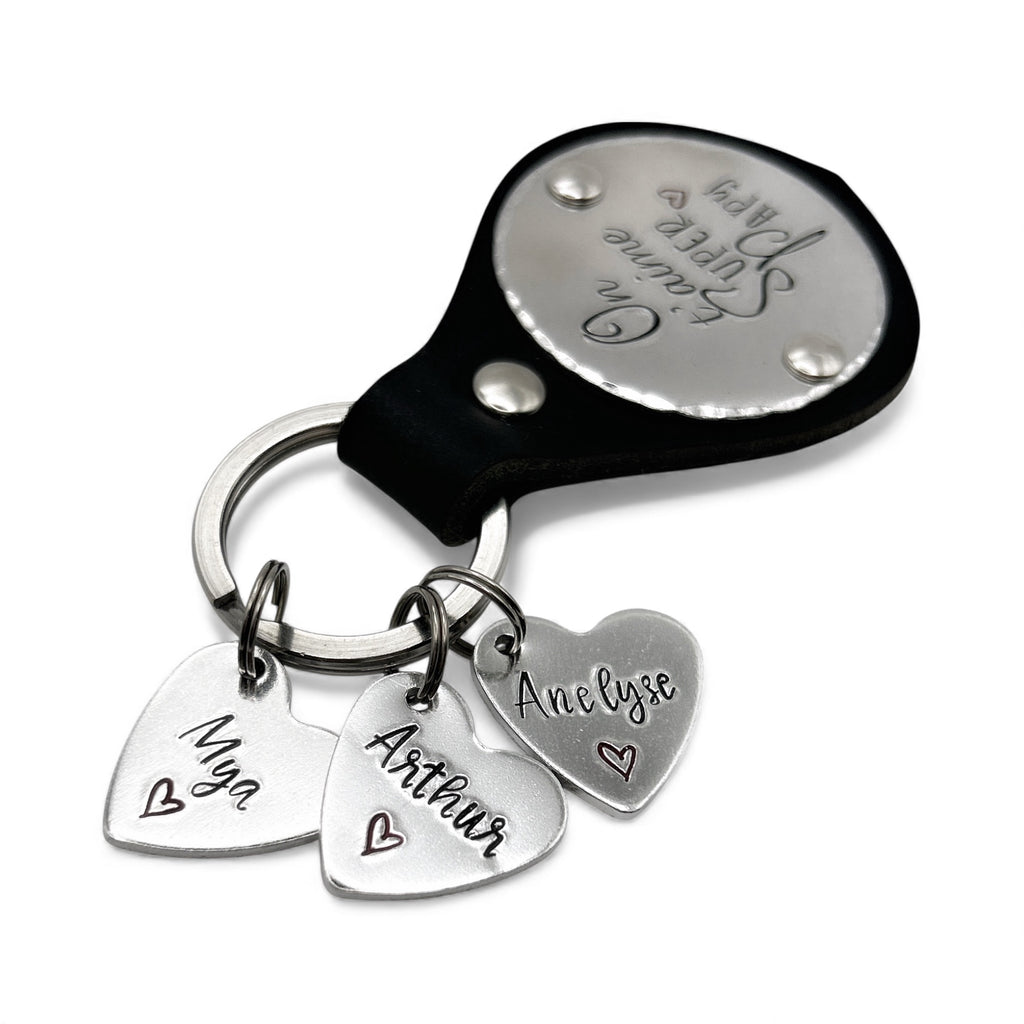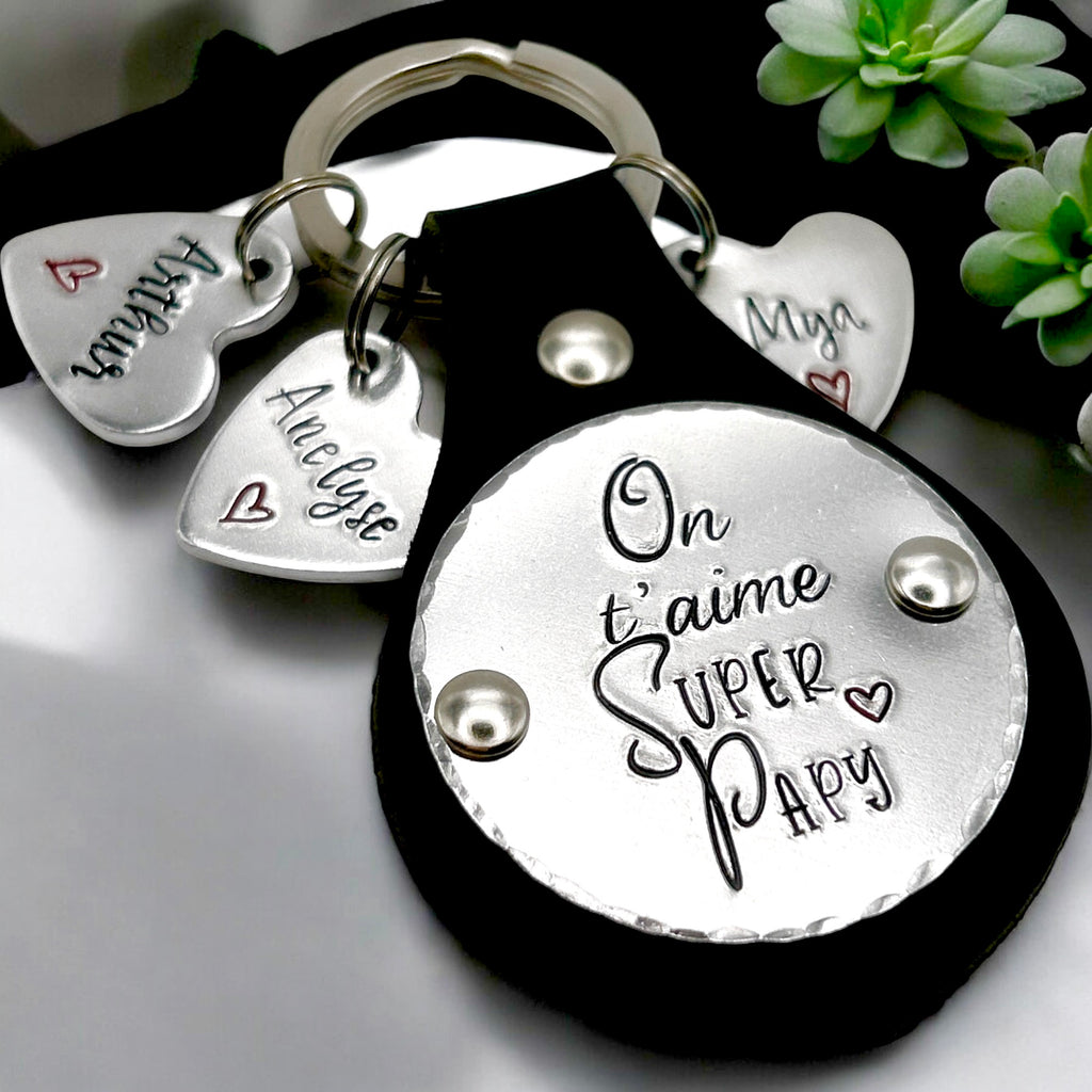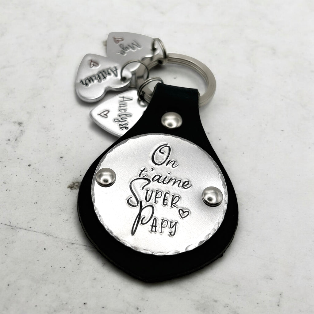 Offrez un cadeau unique et sentimental pour la fête des grands-pères avec ce porte-clés fait main, en cuir véritable et aluminium. Chaque pièce est estampillée à la main (hand stamped), ce qui en fait un accessoire à la fois élégant et plein de sens.