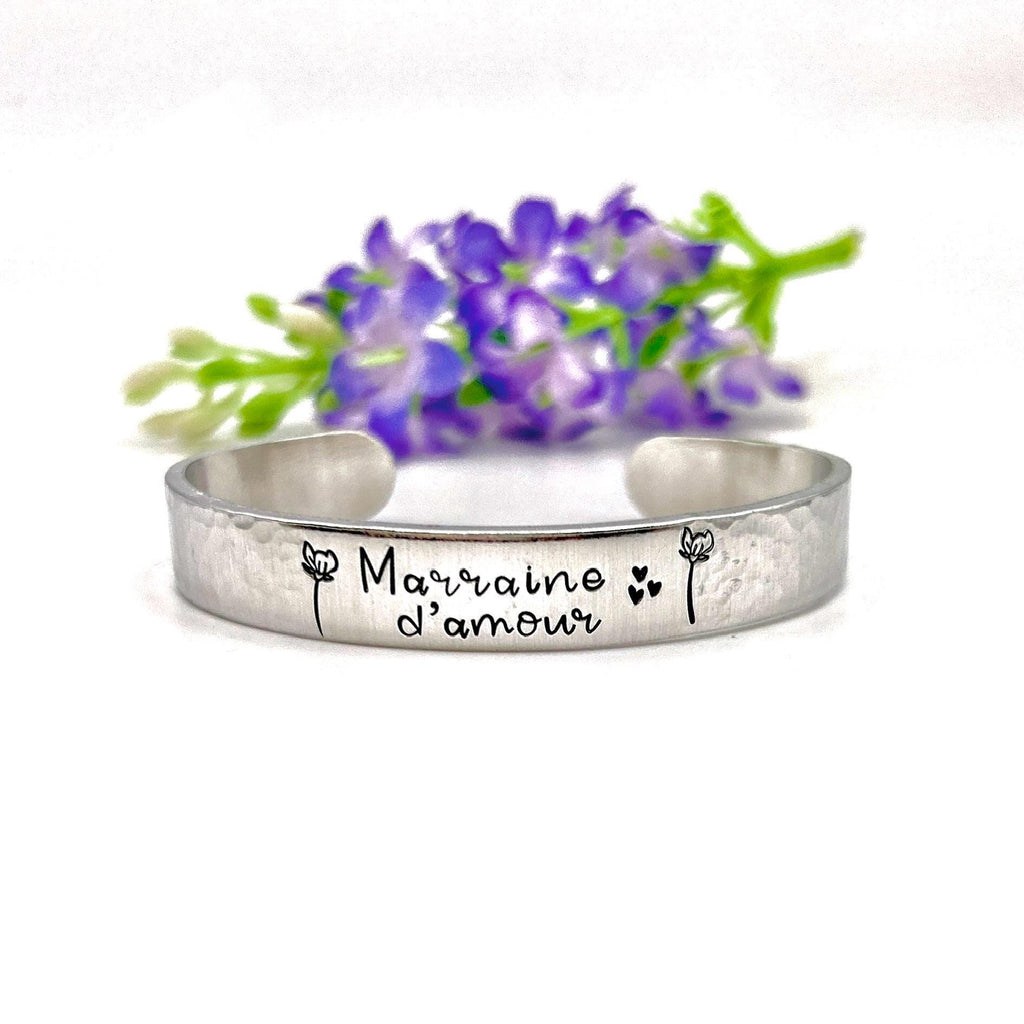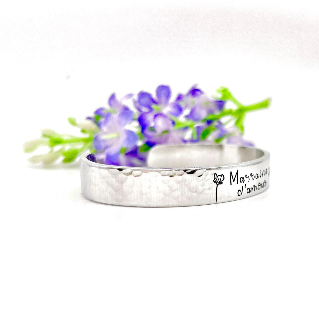 Bracelet jonc en aluminium, délicatement martelé sur les côtés et gravé à la main du message « Marraine d’amour