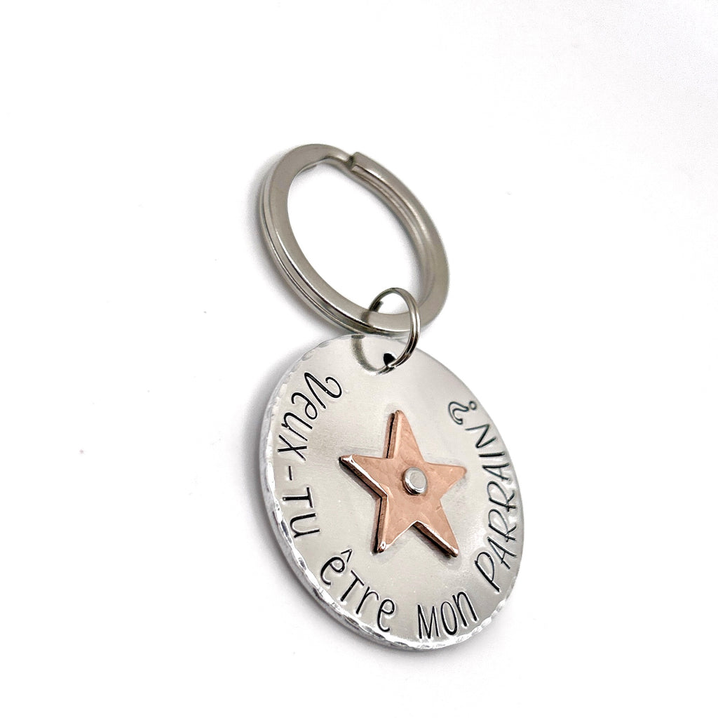 Ce porte-clé en aluminium et en cuivre a été gravé à la main. Le cadeau parfait pour un nouveau parrain!.