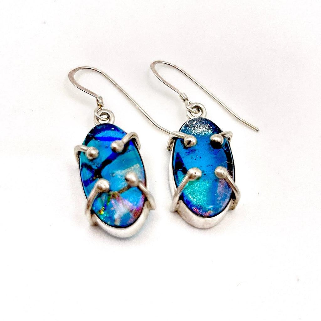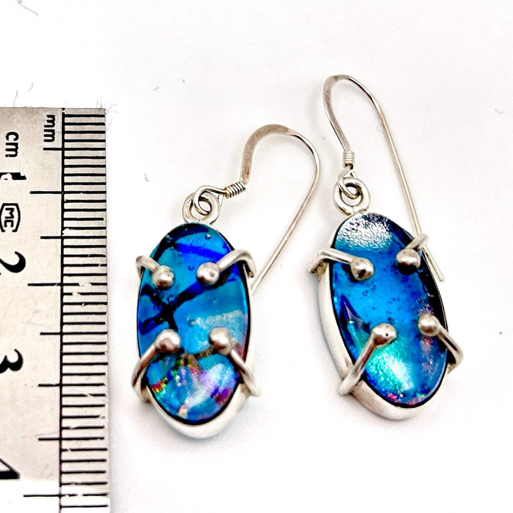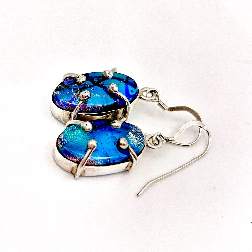 Handmade earrings featuring luminous dichroic glass with rich blue and iridescent rainbow tones that shift with the light. Each glass element is securely set in solid sterling silver, creating a modern, elegant design that highlights the depth and sparkle of the glass.