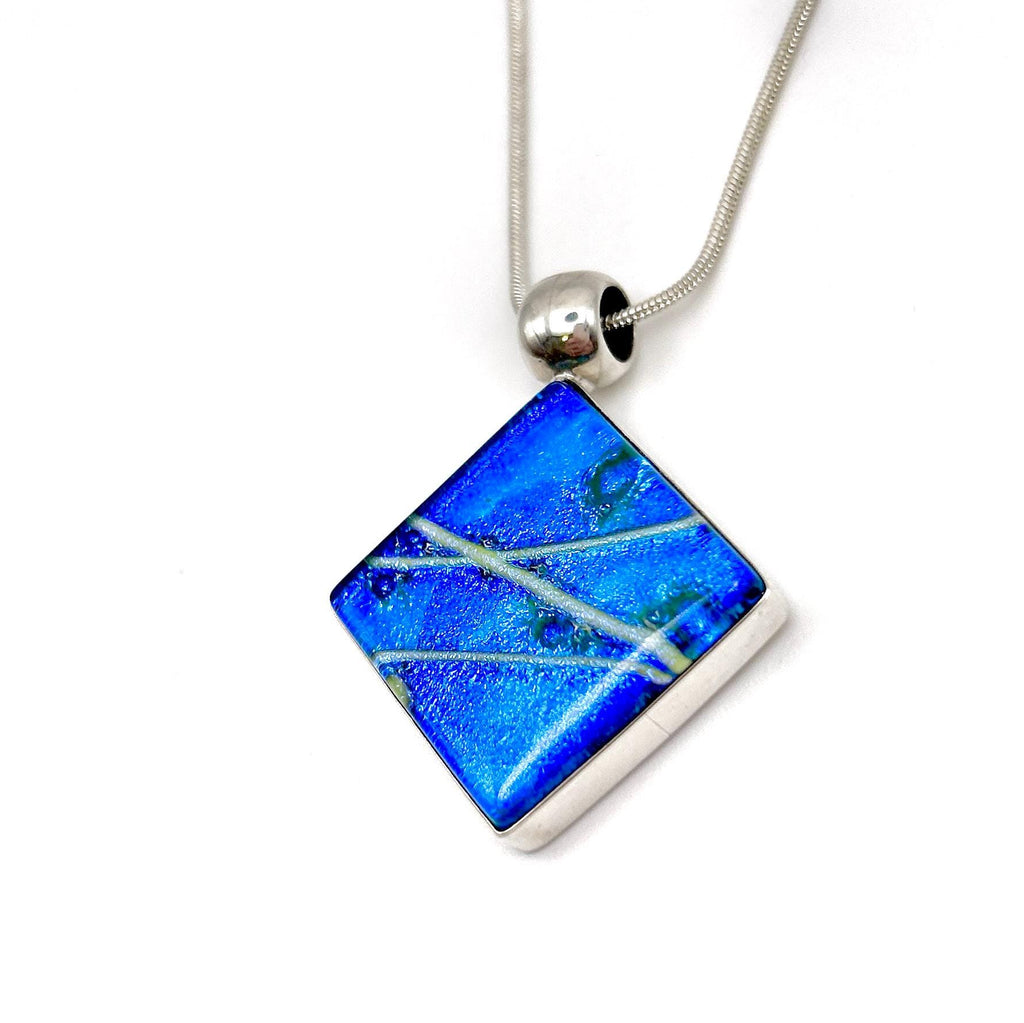 This beautiful handmade pendant features vibrant fused dichroic glass, fully encased in solid sterling silver. The glass shimmers in rich shades of deep blue, highlighted by fine yellow line details that form an elegant, flowing pattern. The colours shift subtly in the light, making this a truly eye-catching piece.