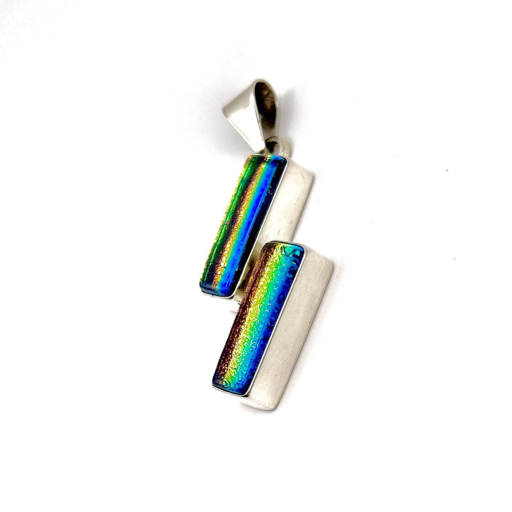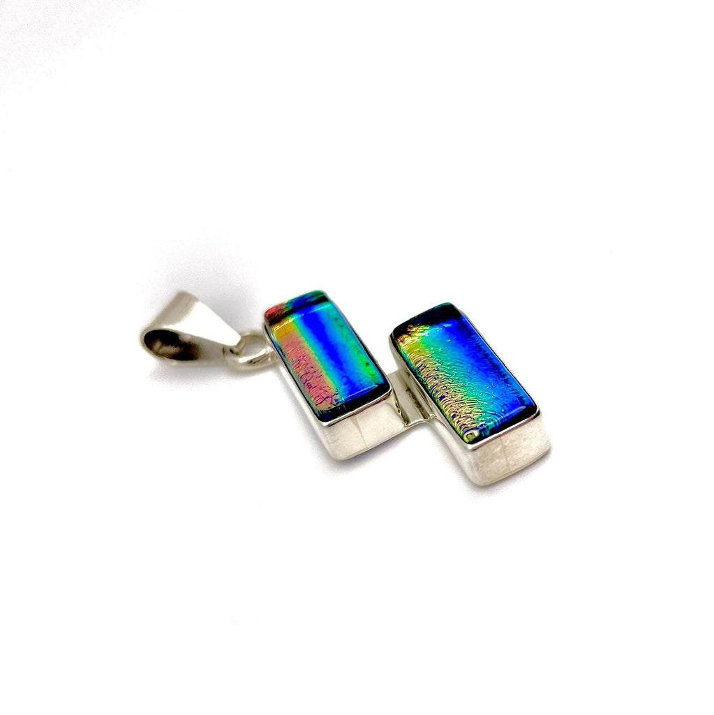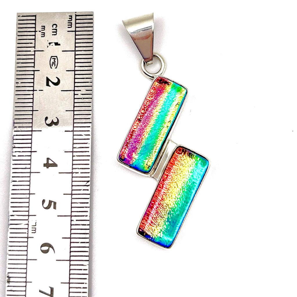 A truly striking, handmade pendant featuring rainbow-coloured fused glass, set in a solid silver frame. Unique, vibrant, and one-of-a-kind – perfect for adding a splash of colour to any outfit.