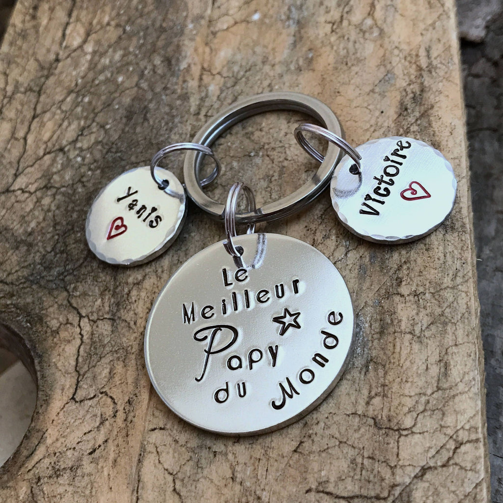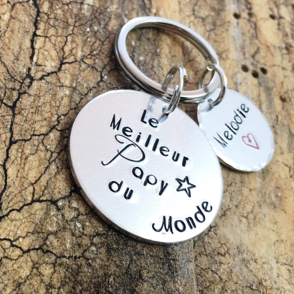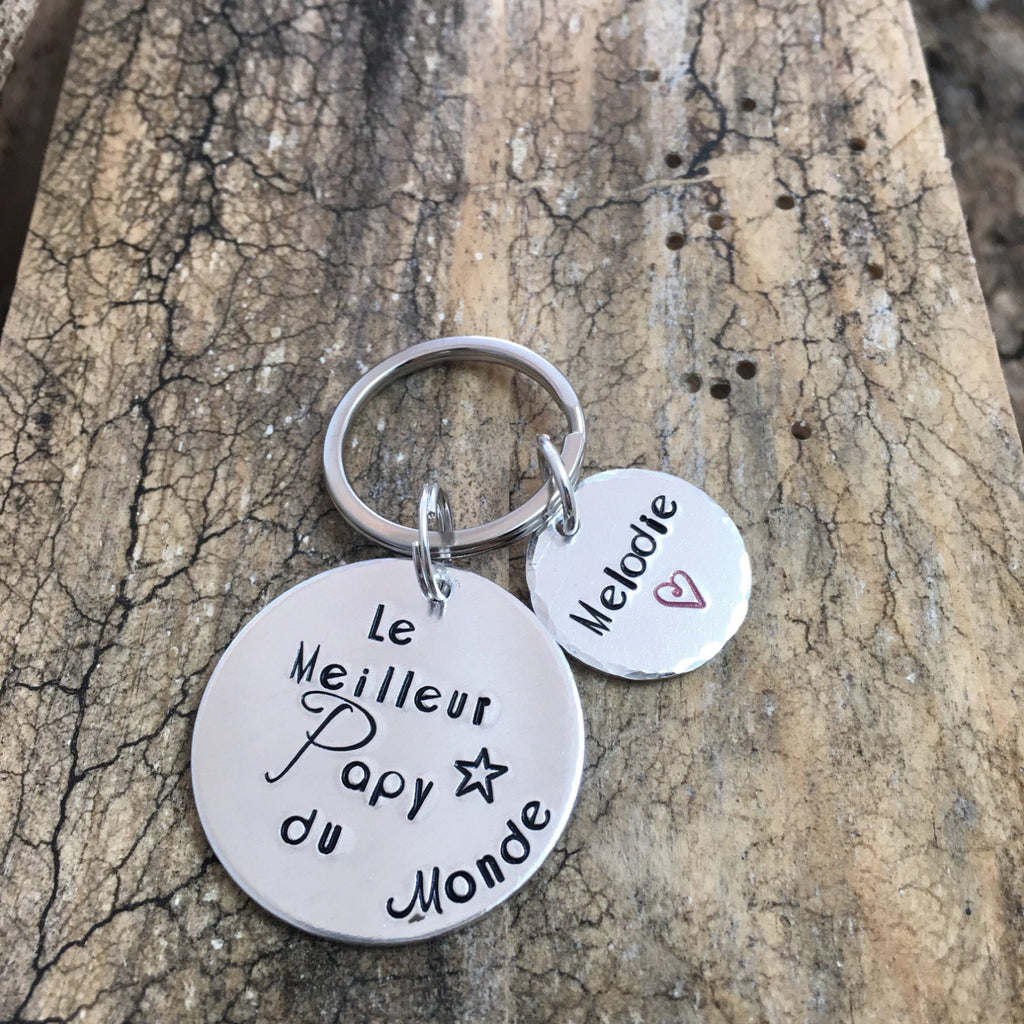 This aluminium disk keyring has been hand stamped with the French words 'La Meilleure Papy du Monde'.