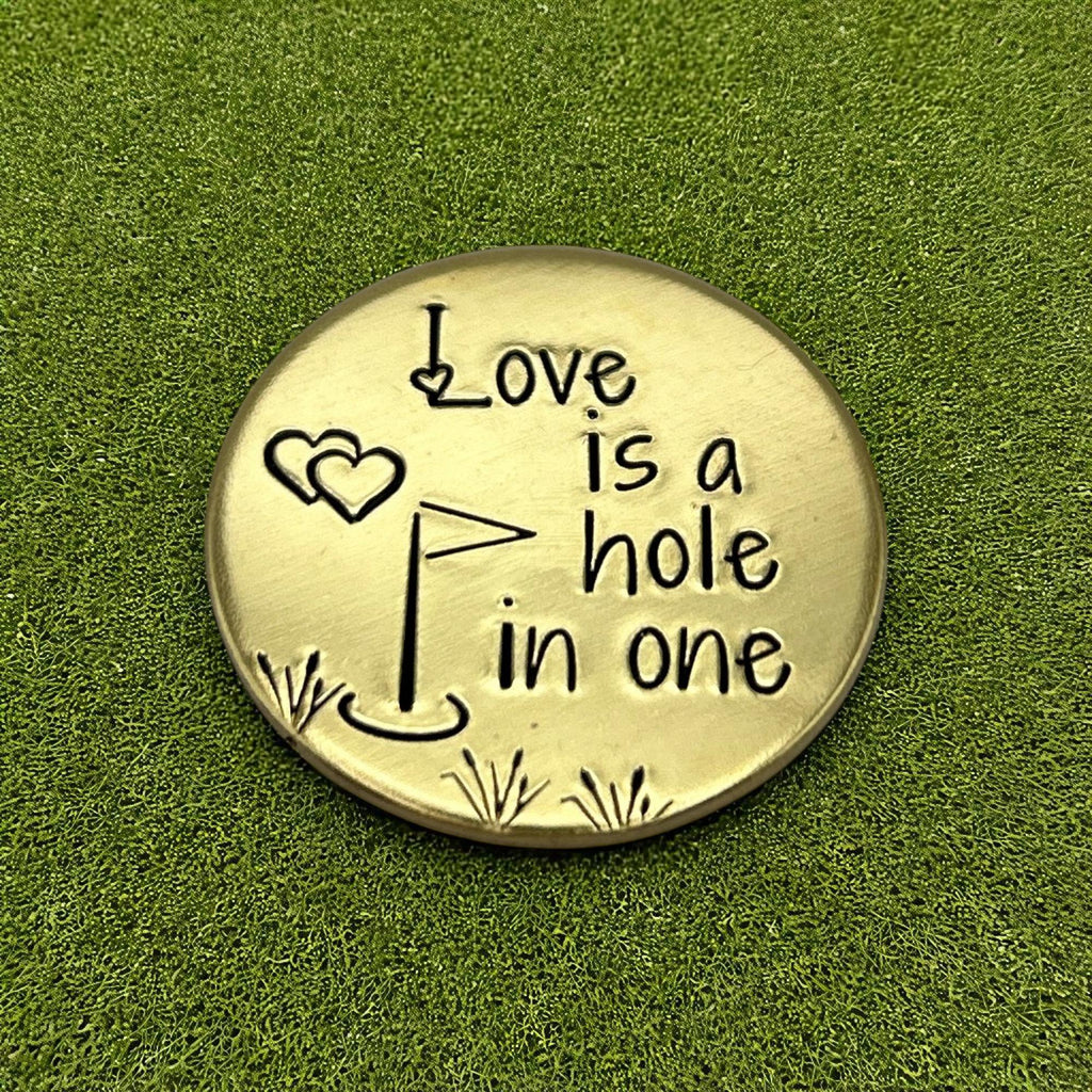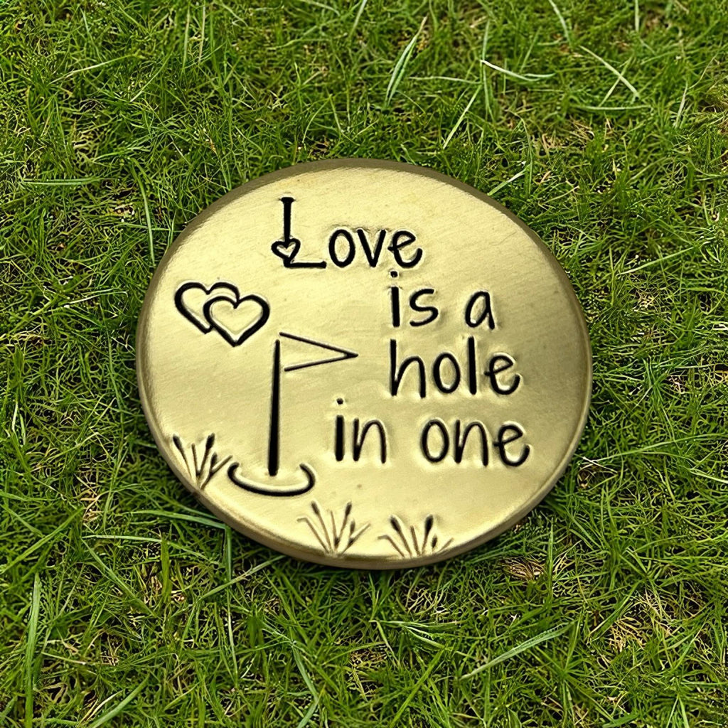Celebrate love and golf with this hand-stamped golf ball marker.