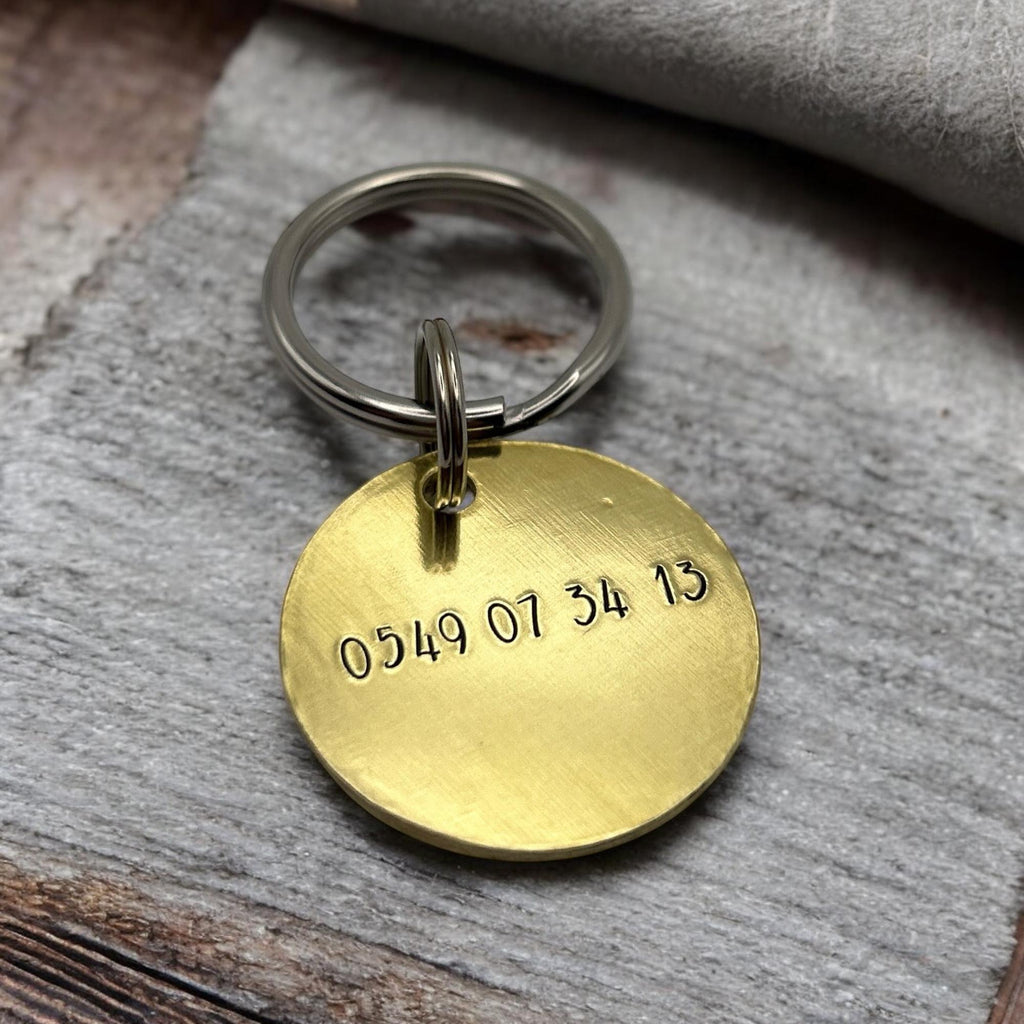 This lovely brass dog identity tag has been hand stamped and I have hammered the outer edges of the disc. It has a protective wax coating to slow down the tarnishing process.