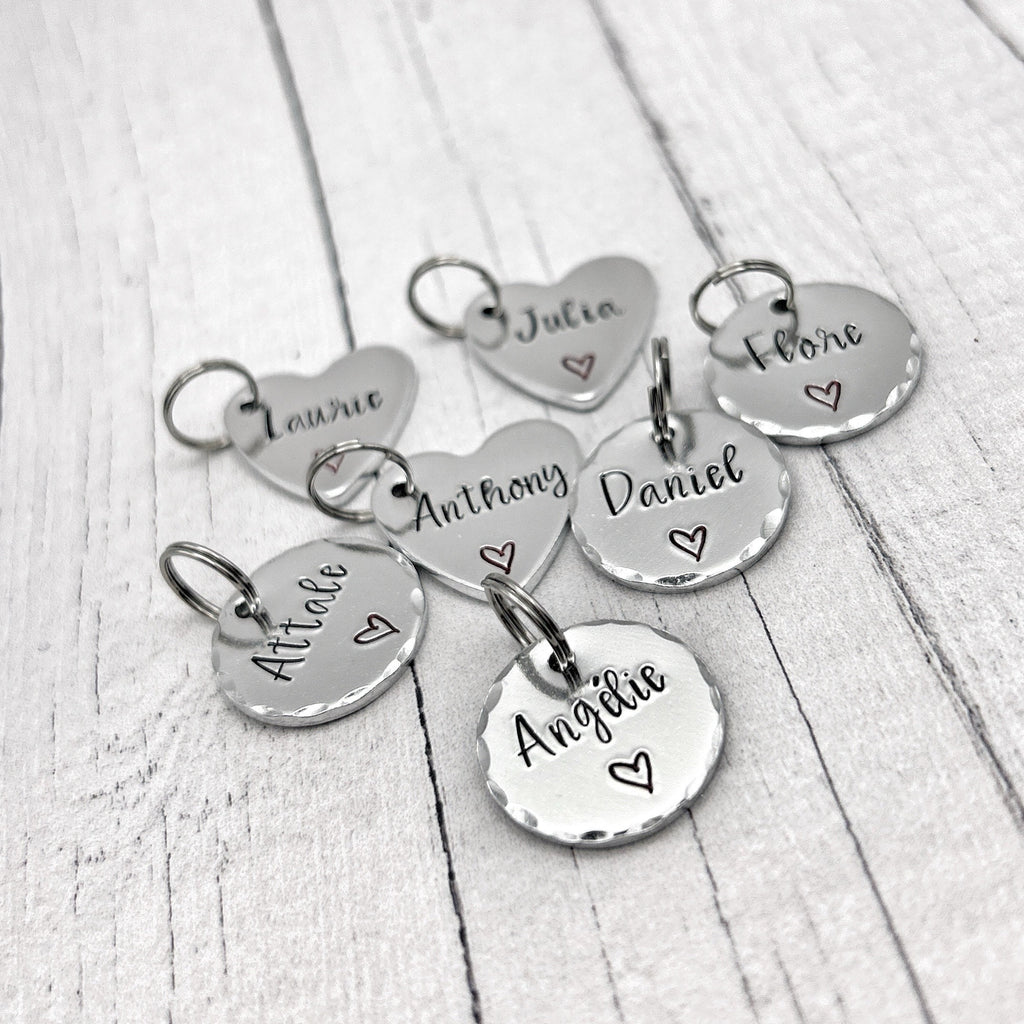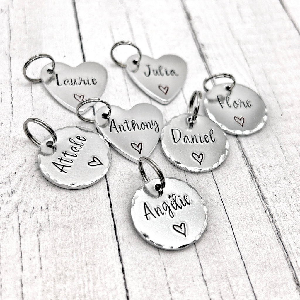 These personalized aluminium name discs and hearts can be hand stamped with ONE name and a small heart.