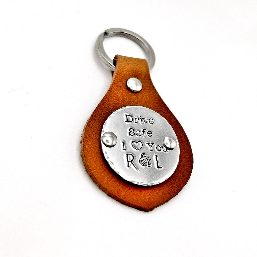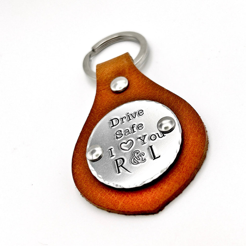 Ce porte clé en aluminium et cuir a été gravé à la main avec le texte;